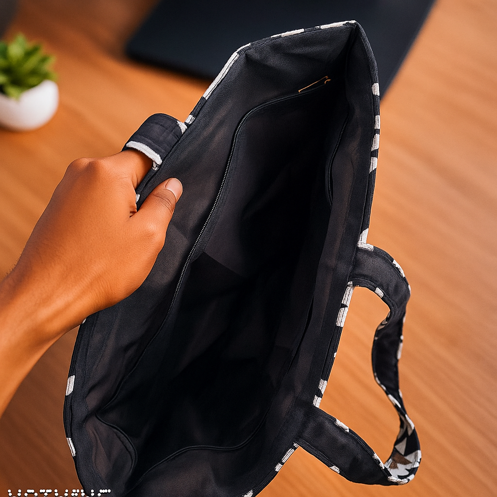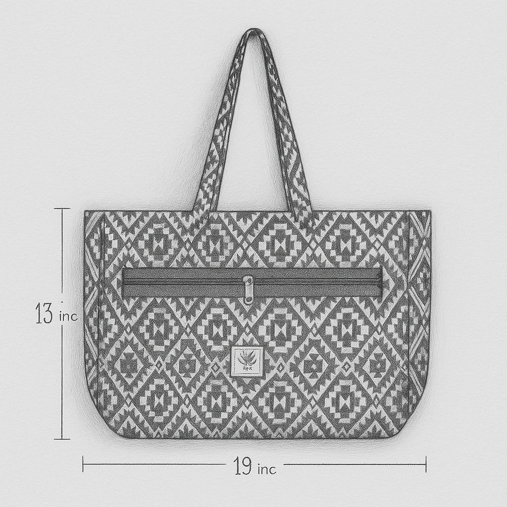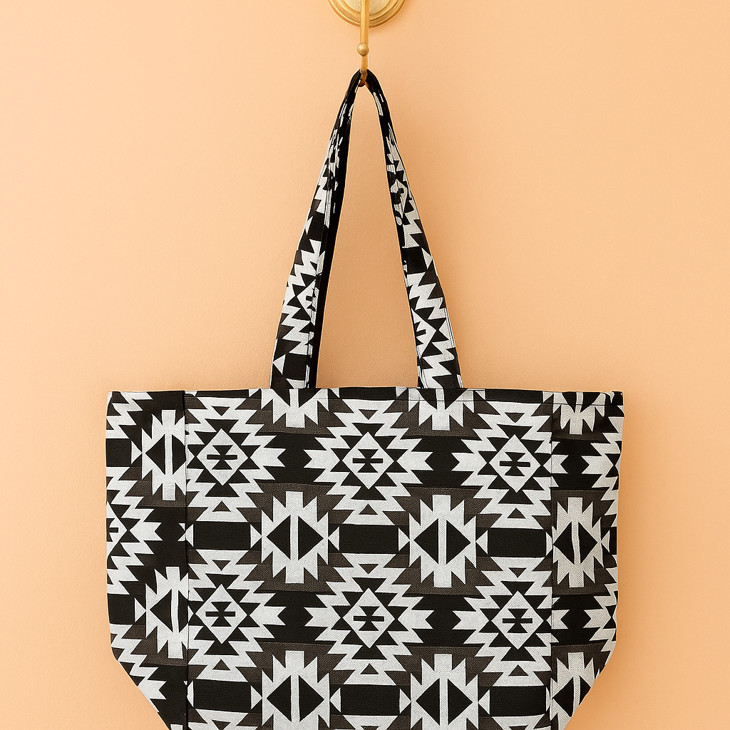 Design: Eye-catching Aztec tribal pattern in black and white with geometric symmetry