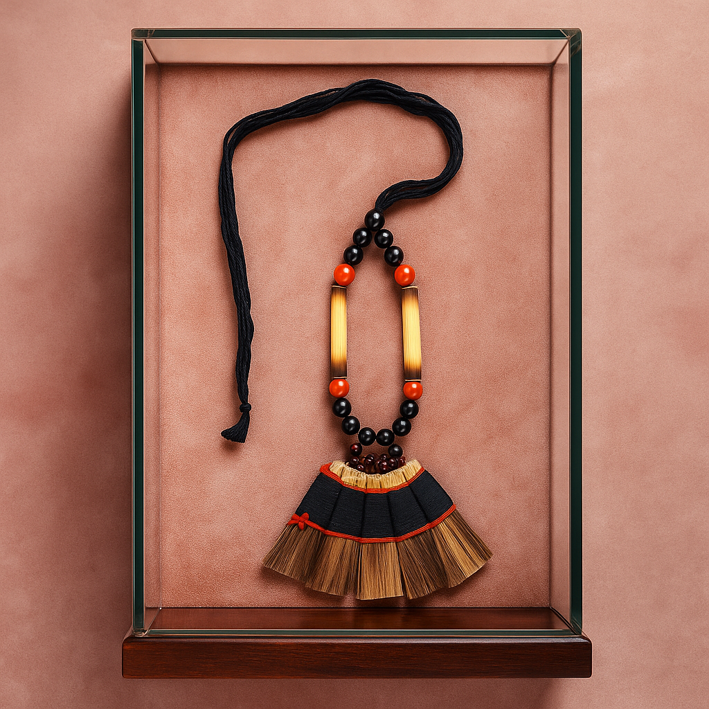 Pendant Design: Handcrafted fan-shaped pendant with black and red detailing, made from natural grass and thread