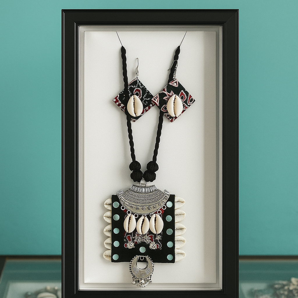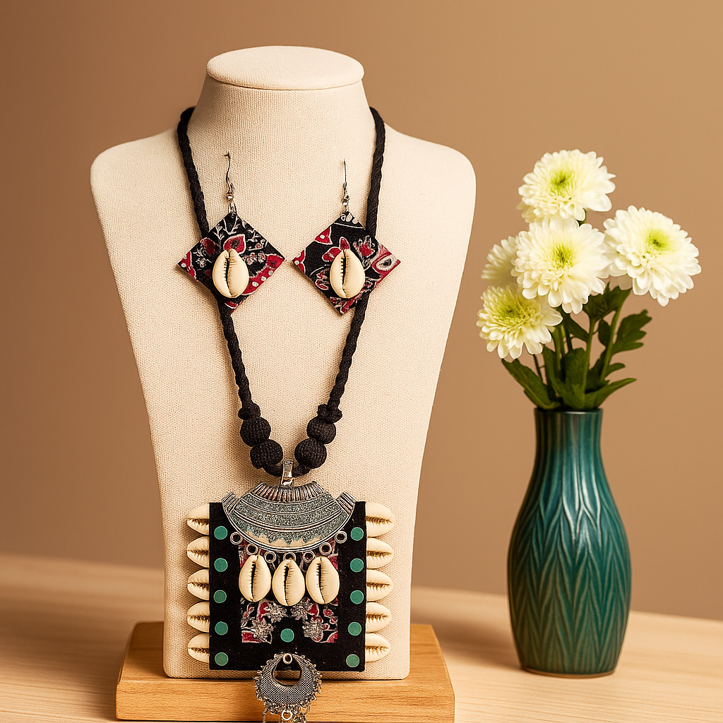 Pendant Design: Rectangular black pendant with red floral accents, bordered with cowrie shells and oxidized silver centerpiece