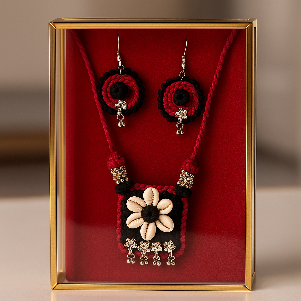 Pendant Design: Square pendant with floral cowrie shell design, bordered in black & red thread with silver danglers