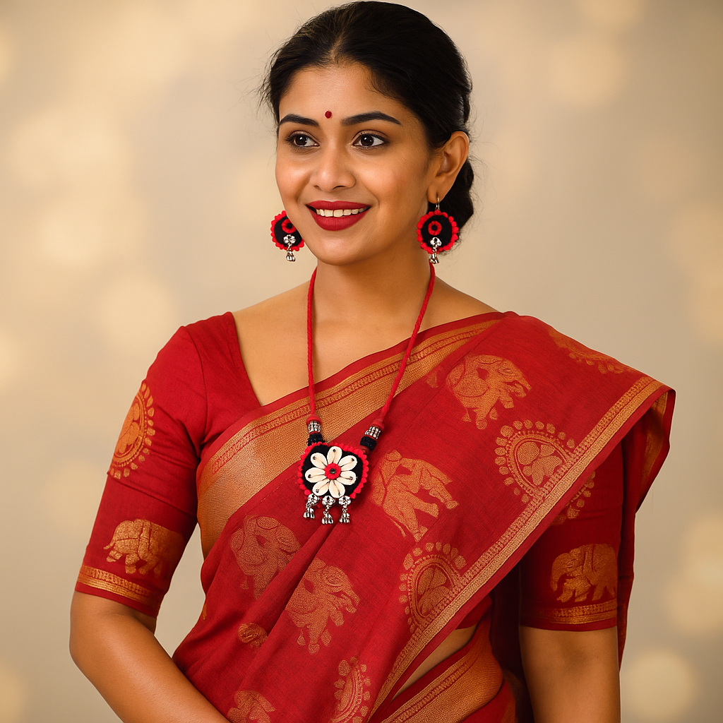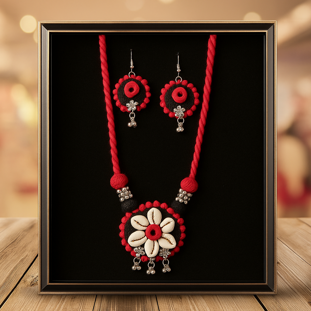 Pendant Design: Round pendant with floral cowrie shell motif, bordered in black & red with silver danglers