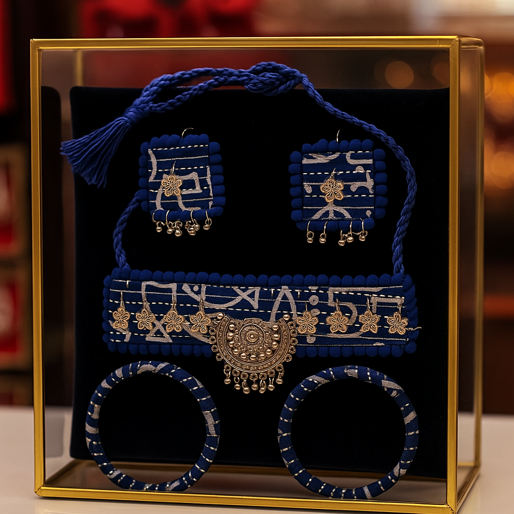 Choker Design: Rectangular blue fabric choker with printed patterns, adorned with oxidized charms and a central crescent pendant with dangling beads