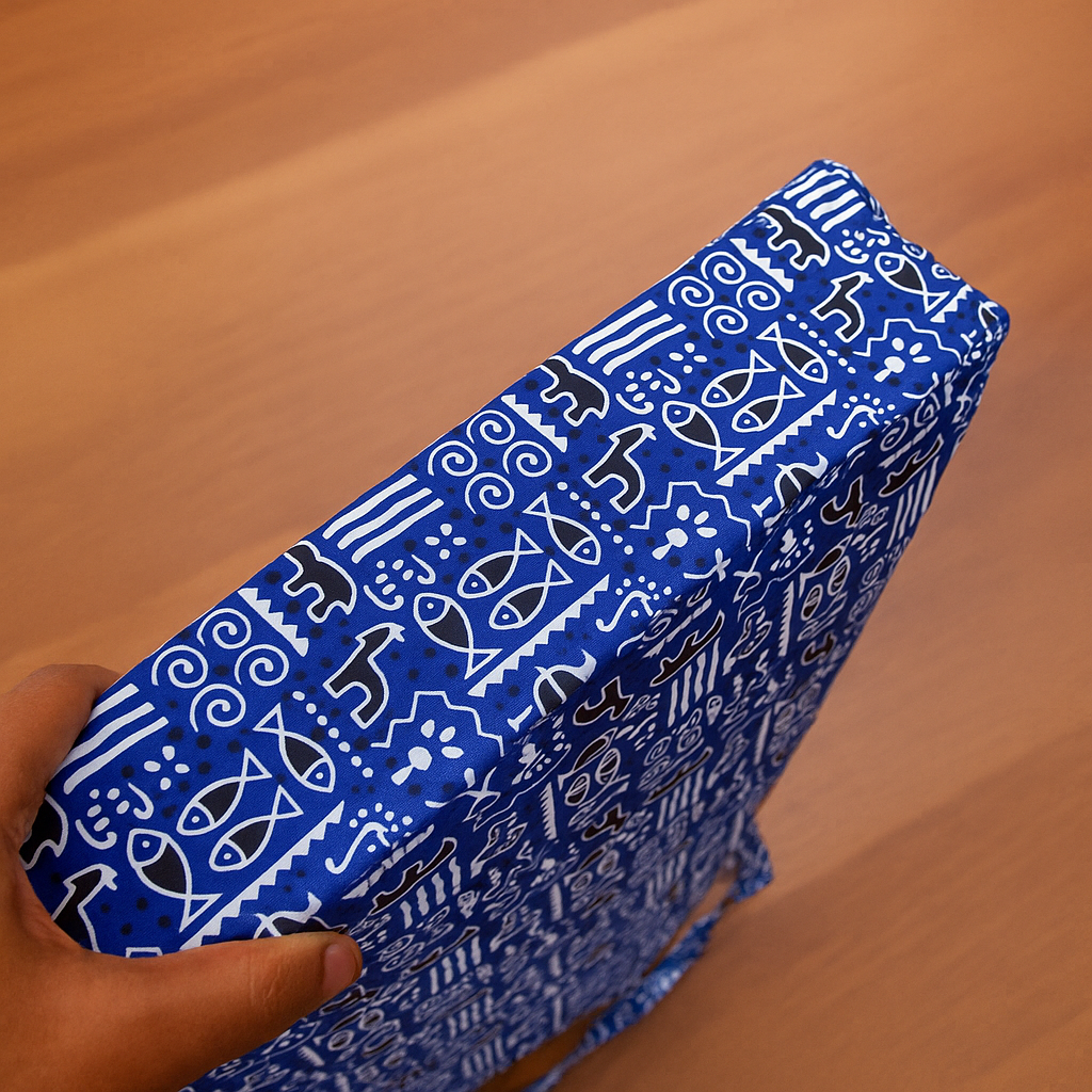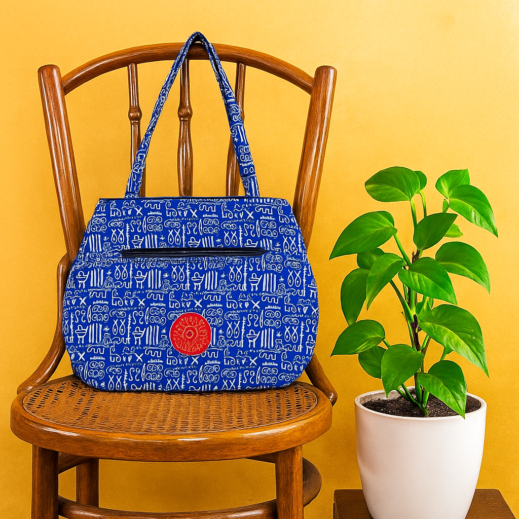 Design: Bright blue base with white tribal script-inspired prints and contrasting red round patch