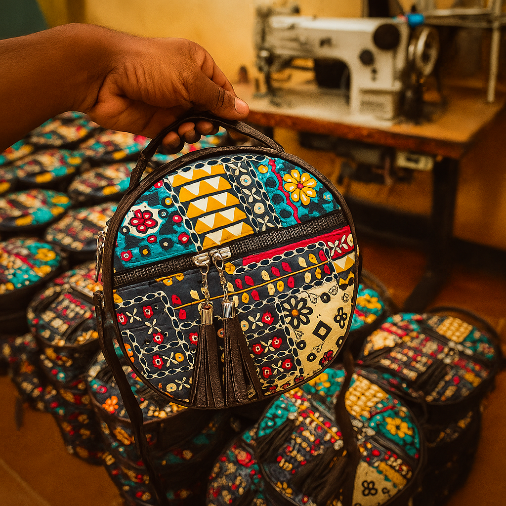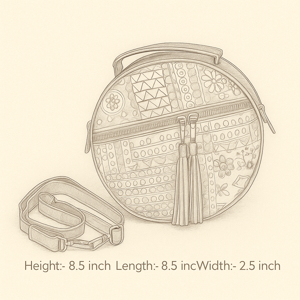 Design: Round structure with multicolor geometric & floral patchwork pattern + 3 faux leather hanging tassels
