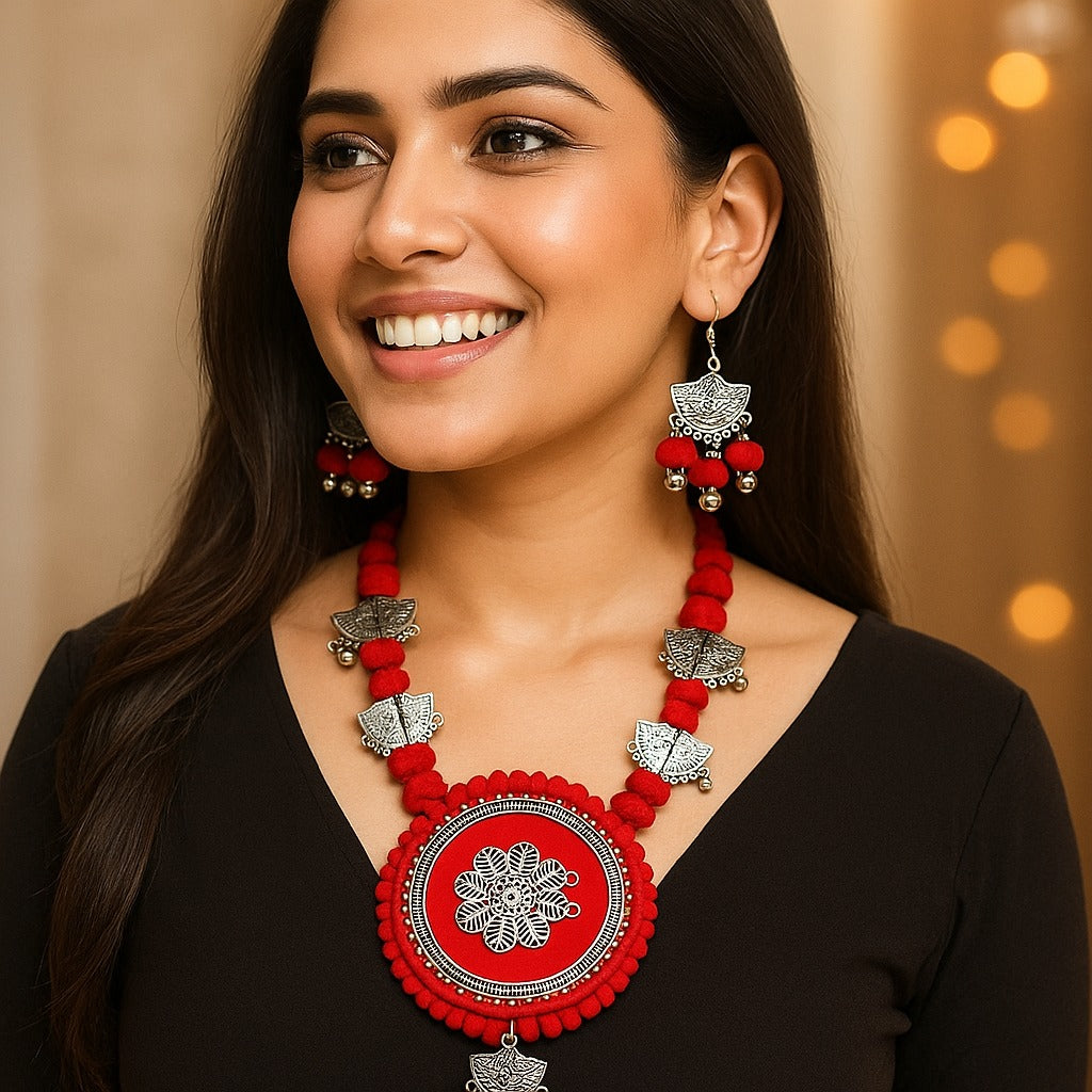 Earrings: Matching oxidized silver earrings with red bead tassels