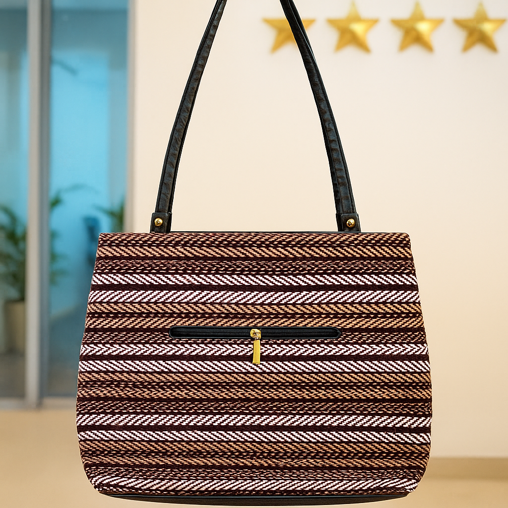 Design: Brown and white diagonal striped pattern with a stylish round orange patch at the center