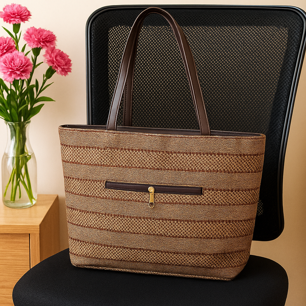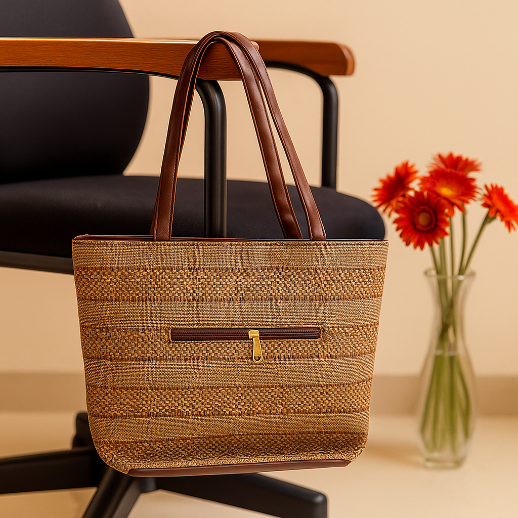 Handles: Dual dark brown leatherette straps – durable & elegant