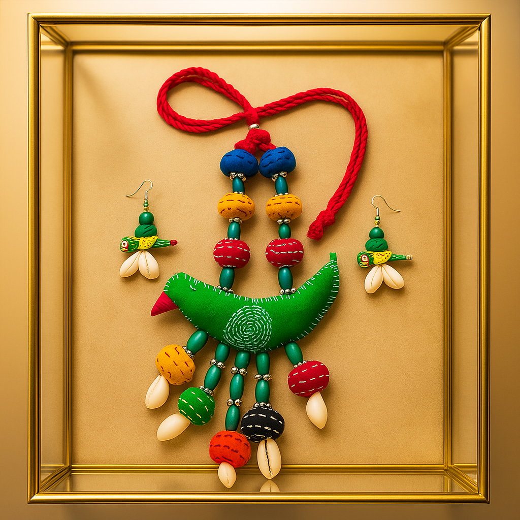 Decorative Elements: Multicolor stitched beads, cowrie shells, mini bird-shaped earrings
