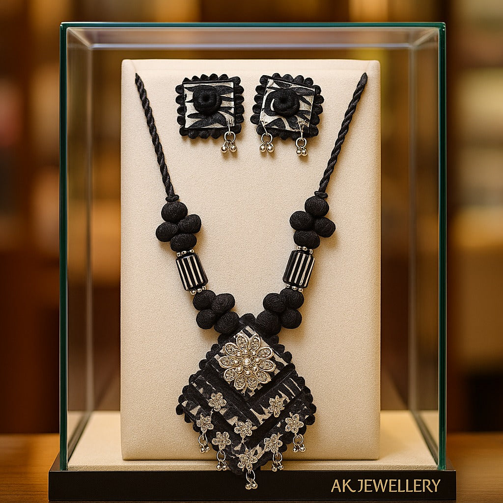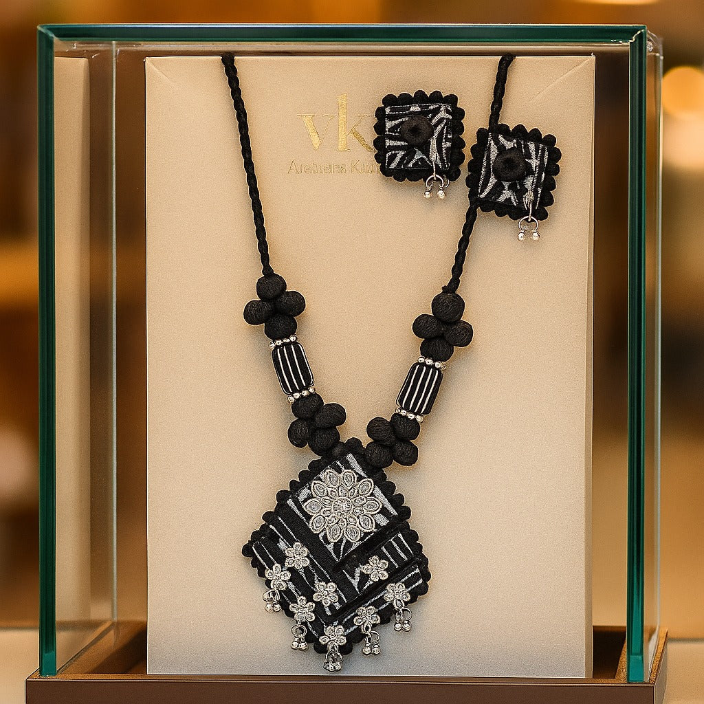 Earrings: Coordinated black oxidized square studs with dangling charm