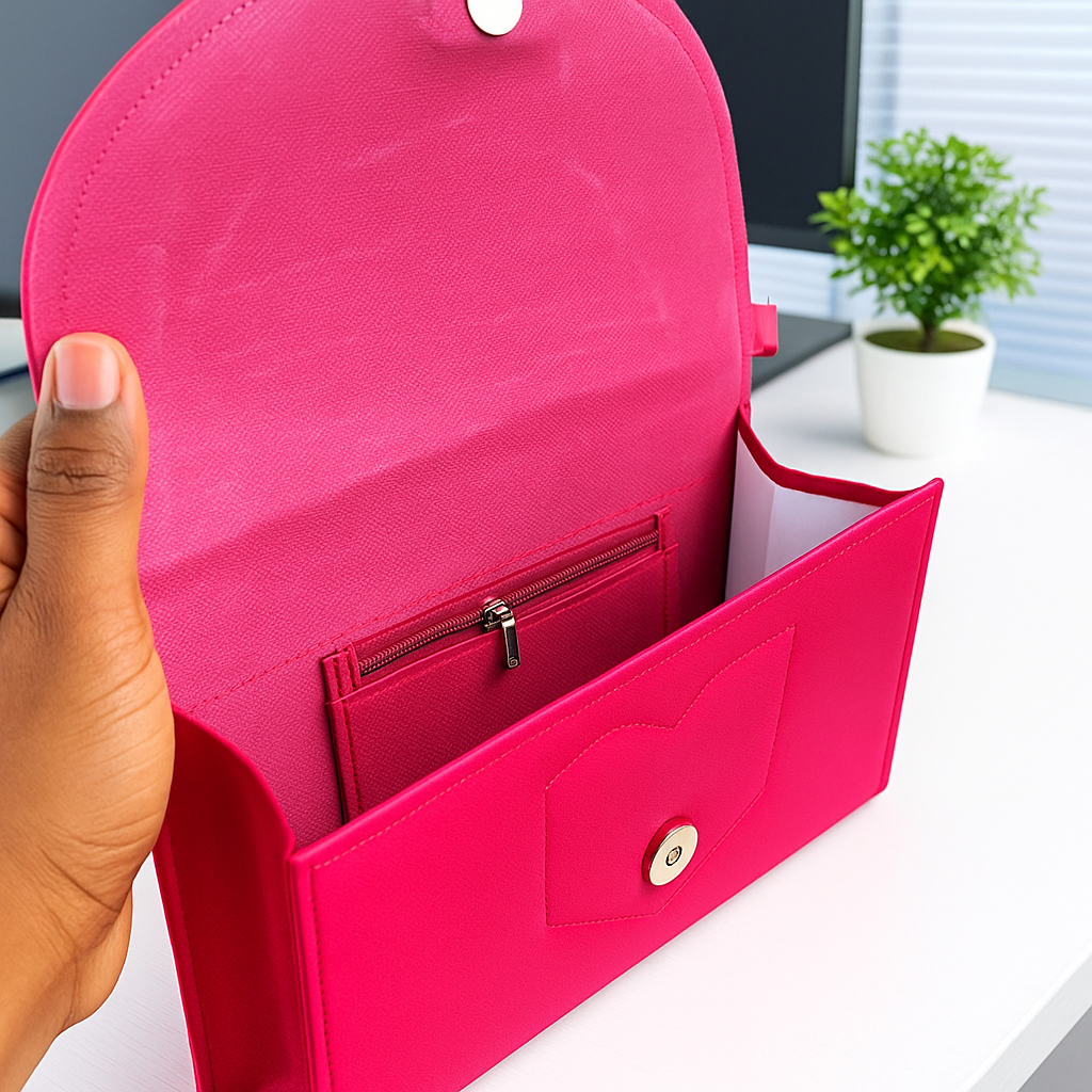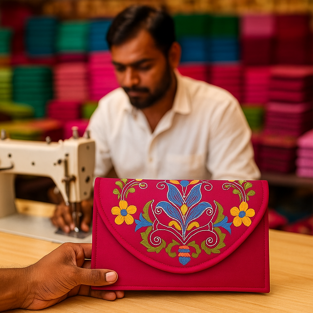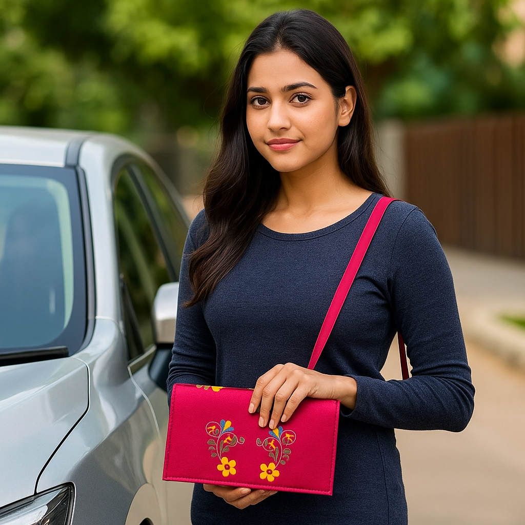 Pattern: Curved flap front with vivid threadwork – blue, yellow, green highlights