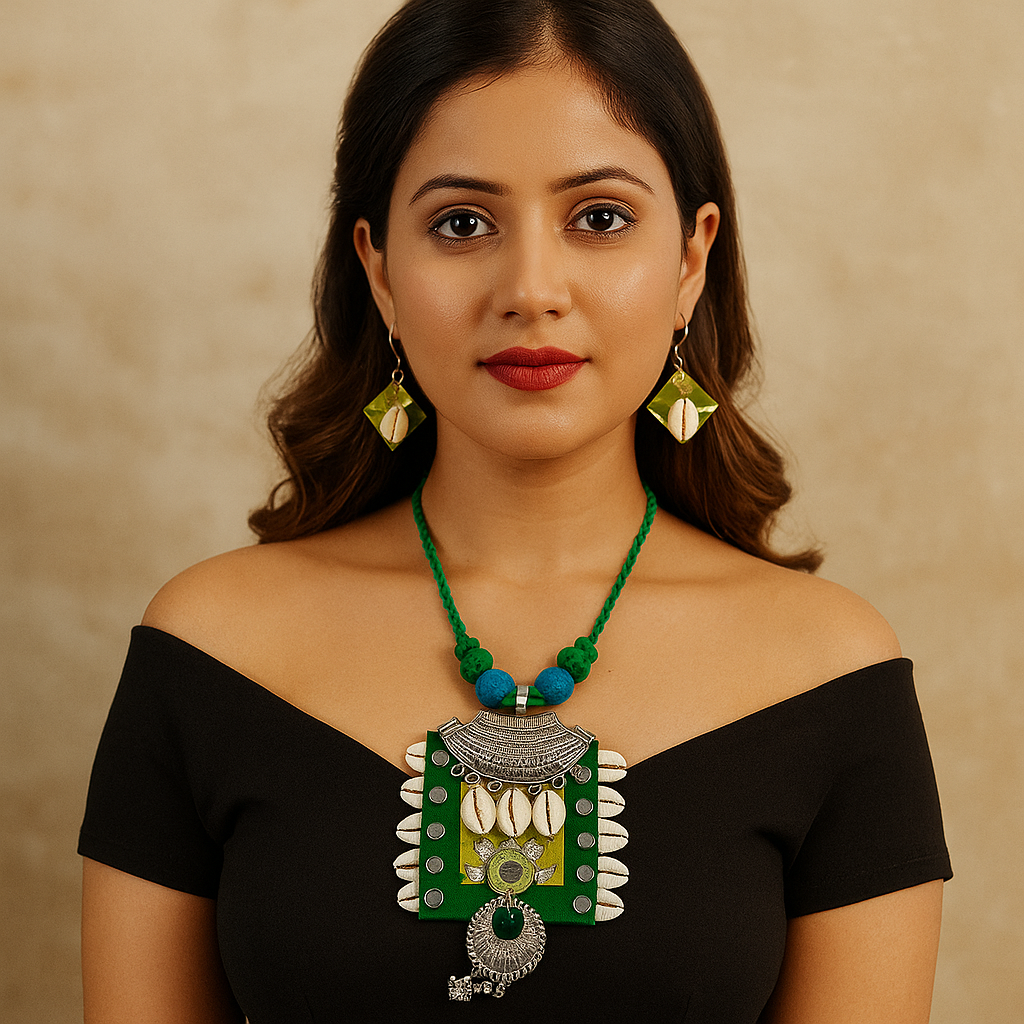 Pendant Design: Rectangular green pendant with oxidized detailing, central floral motif, bordered with cowrie shells