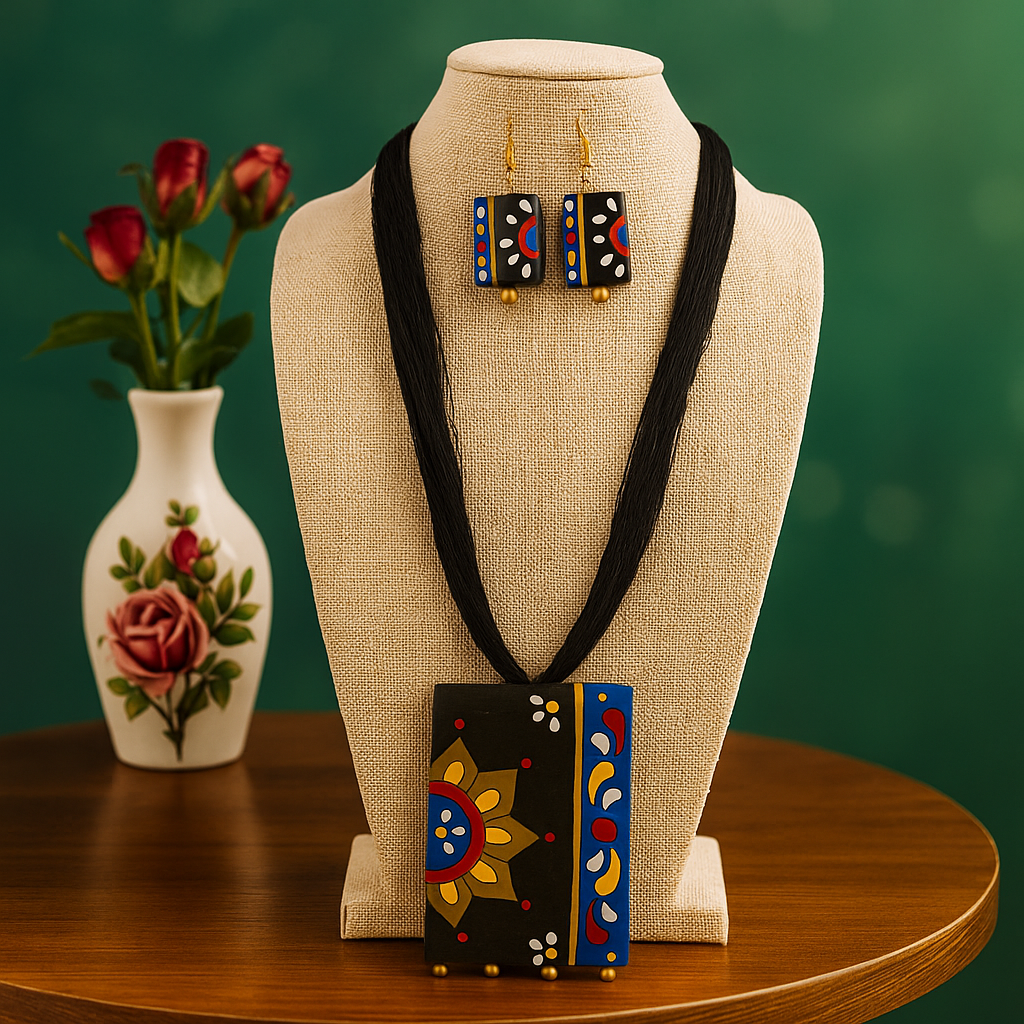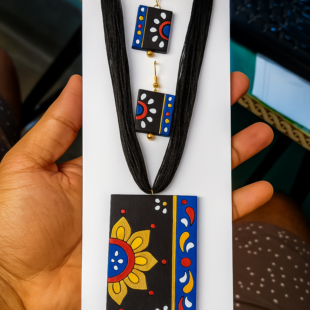 Pendant: Rectangular pendant with traditional folk-art inspired motifs in yellow, red, white & blue
