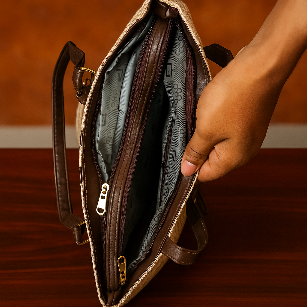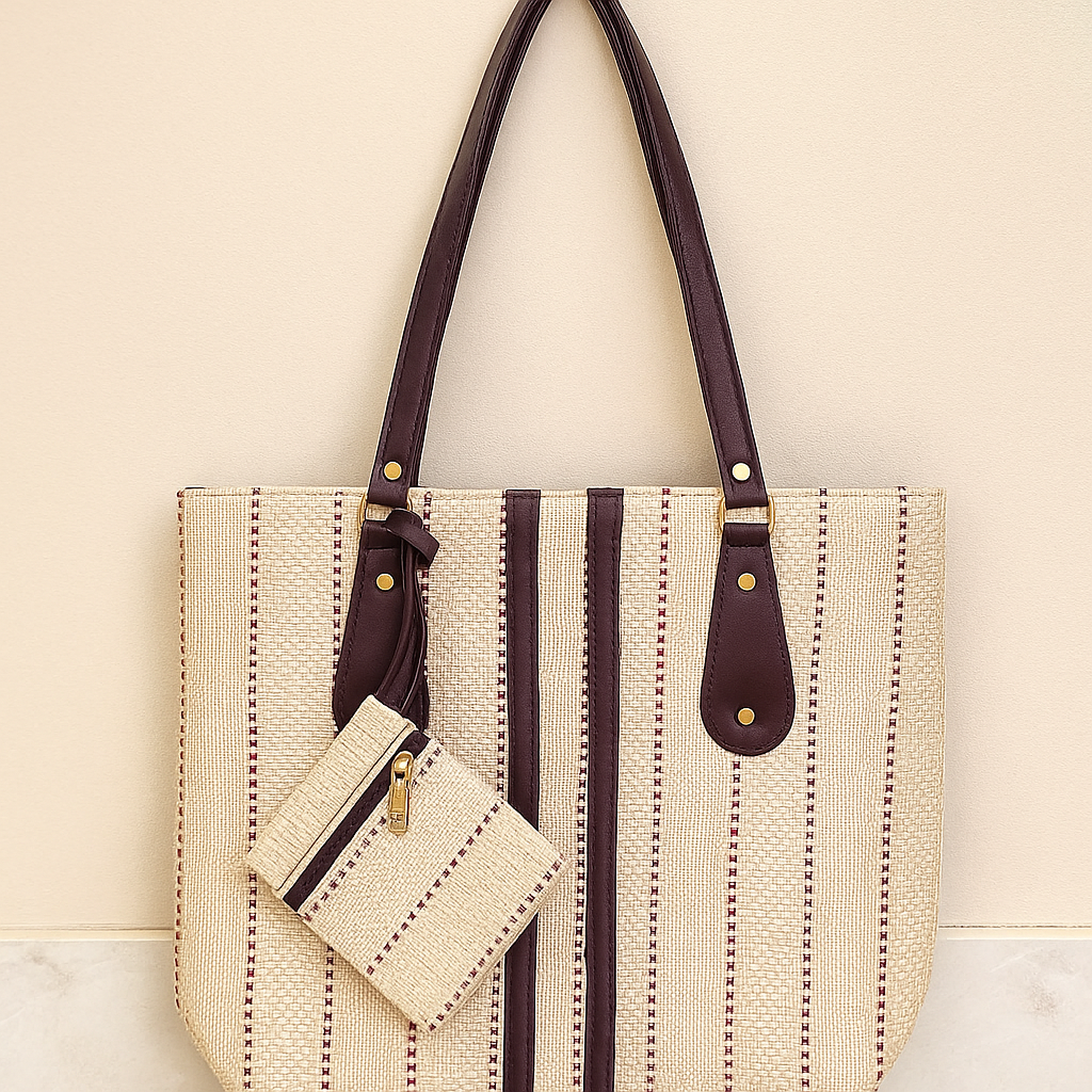 Design: Beige body with neat vertical maroon stitch-style stripes