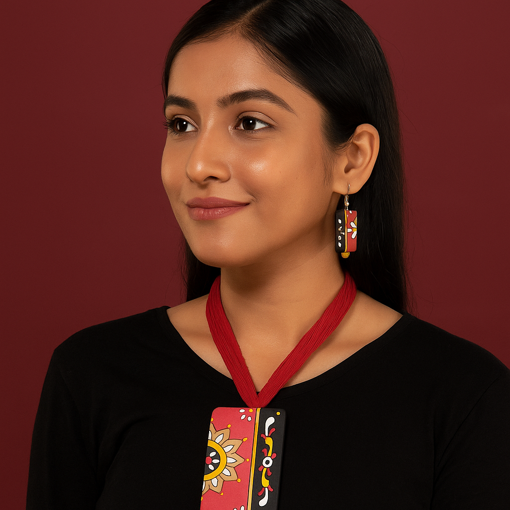 Material: Clay pendant with vibrant cotton thread and wooden bead detailing