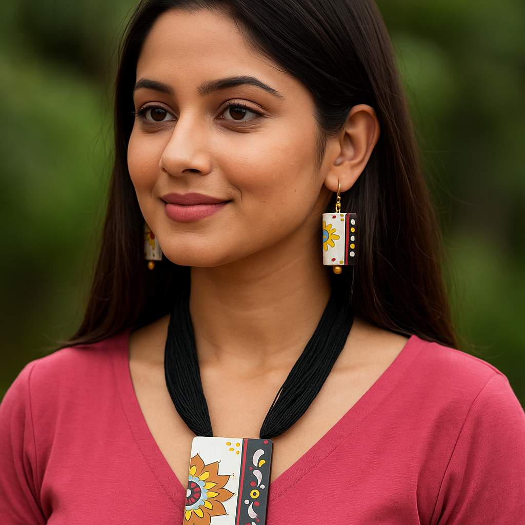 Includes: 1 bold rectangular pendant necklace + 1 pair of matching long earrings