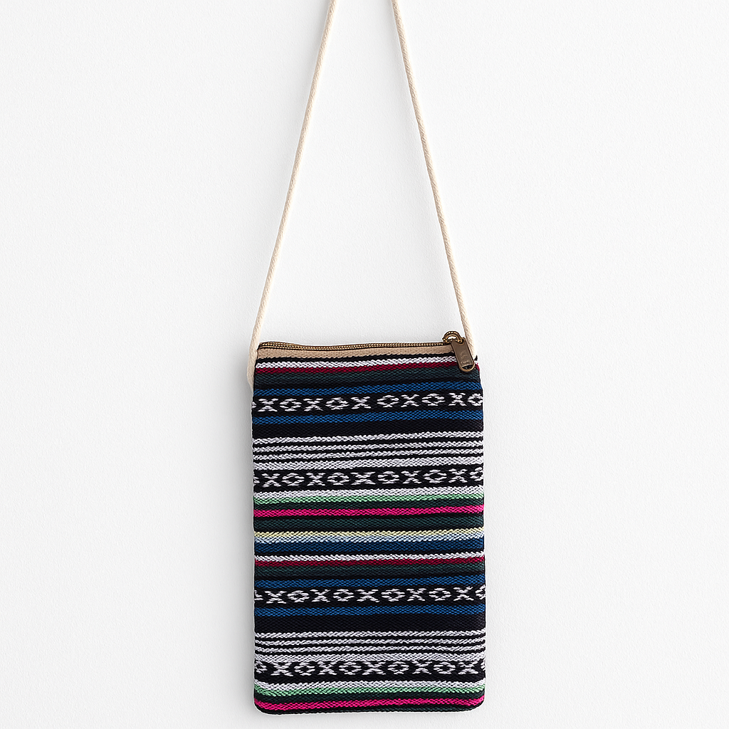 Design: Compact vertical sling with tribal chevron pattern and dual zip pockets