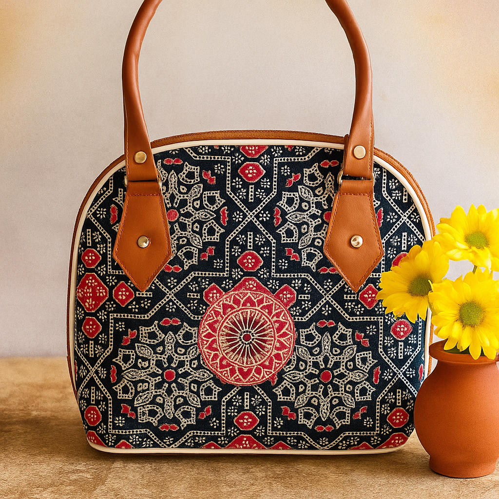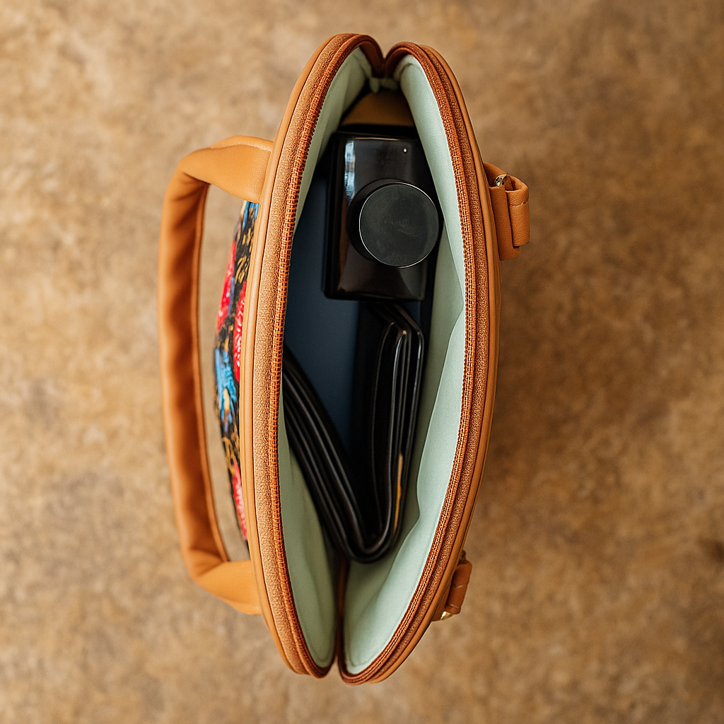 Material: Printed cotton canvas front with faux leather base, piping, and handles