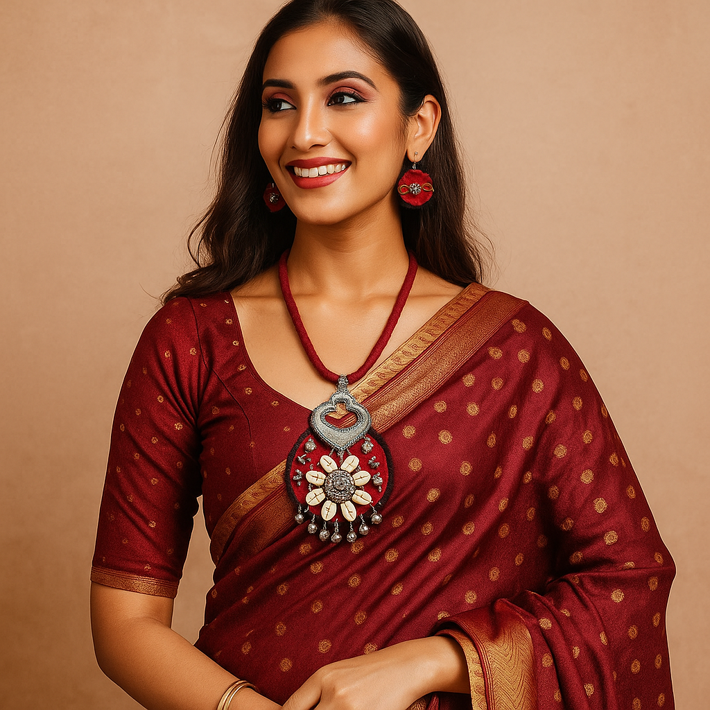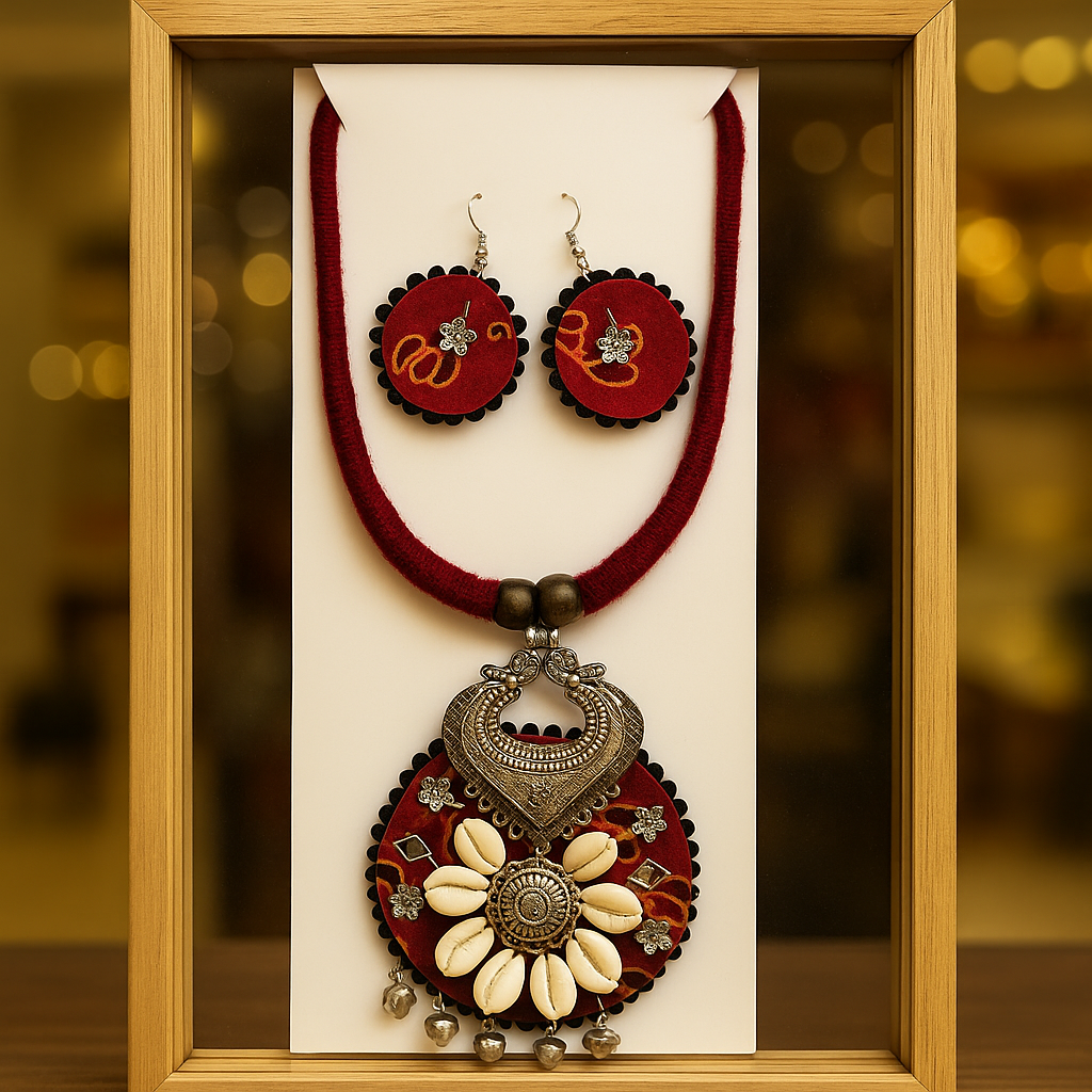 Pendant Design: Large round maroon pendant with central oxidized floral charm, surrounded by cowrie shells and silver embellishments, finished with an oxidized top plate and dangling beads