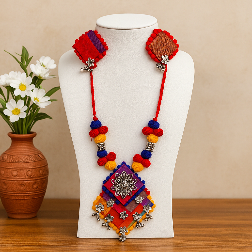 Necklace: Layered multicolor diamond-shaped pendant (red, yellow, blue, purple, orange) with a large oxidized floral motif in the center and floral danglers below
