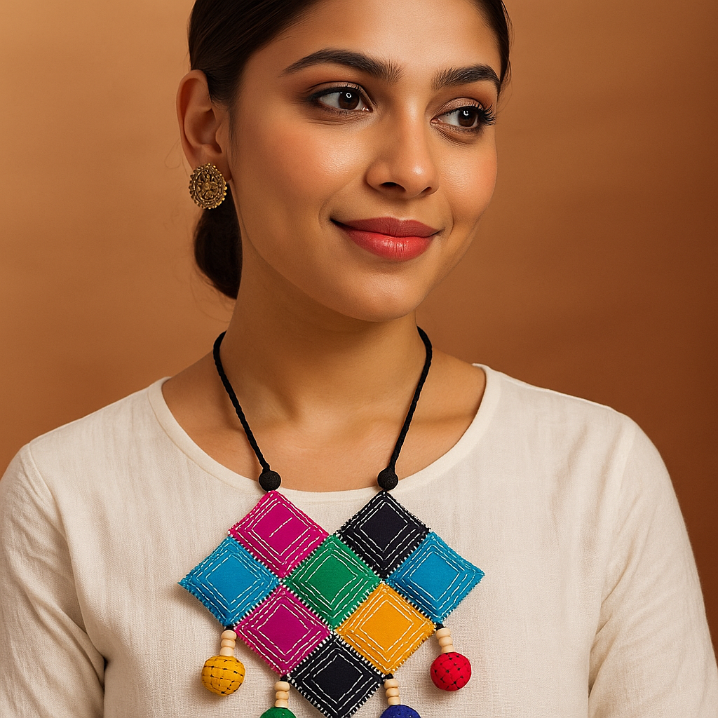 Pendant Style: Bold patch-style pendant with stitched square blocks