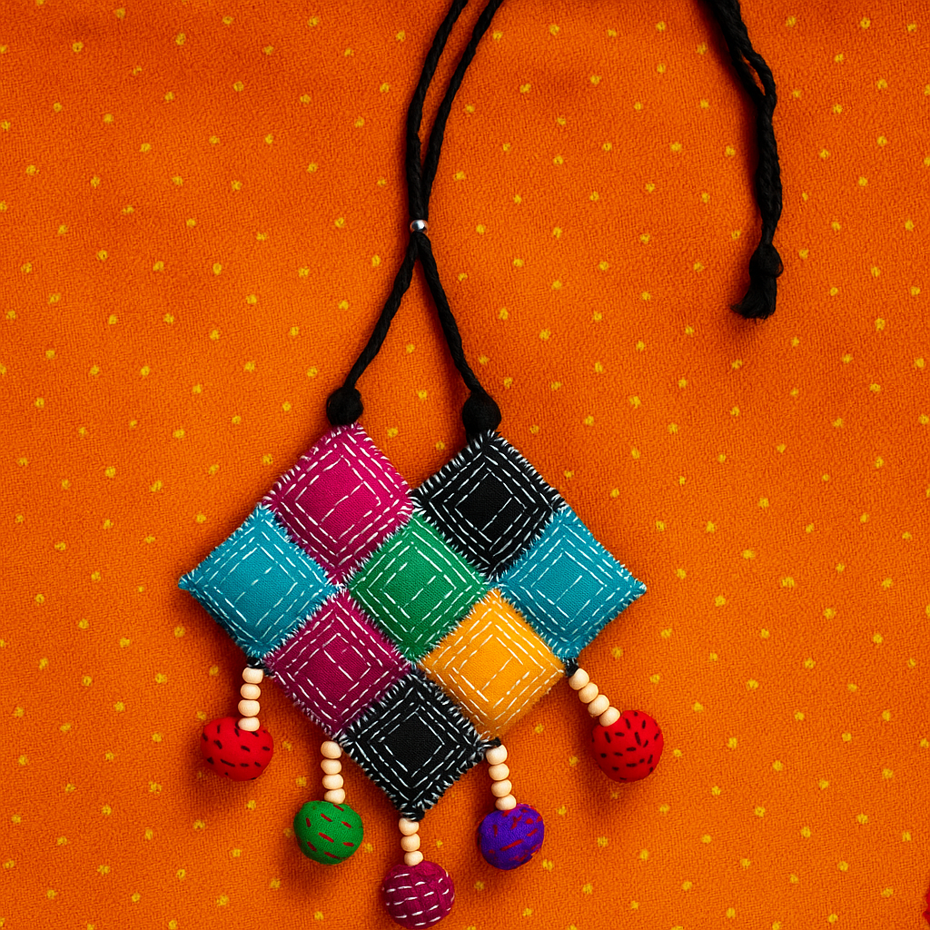 Design Theme: Colorful patchwork with geometric fabric squares and bead drops