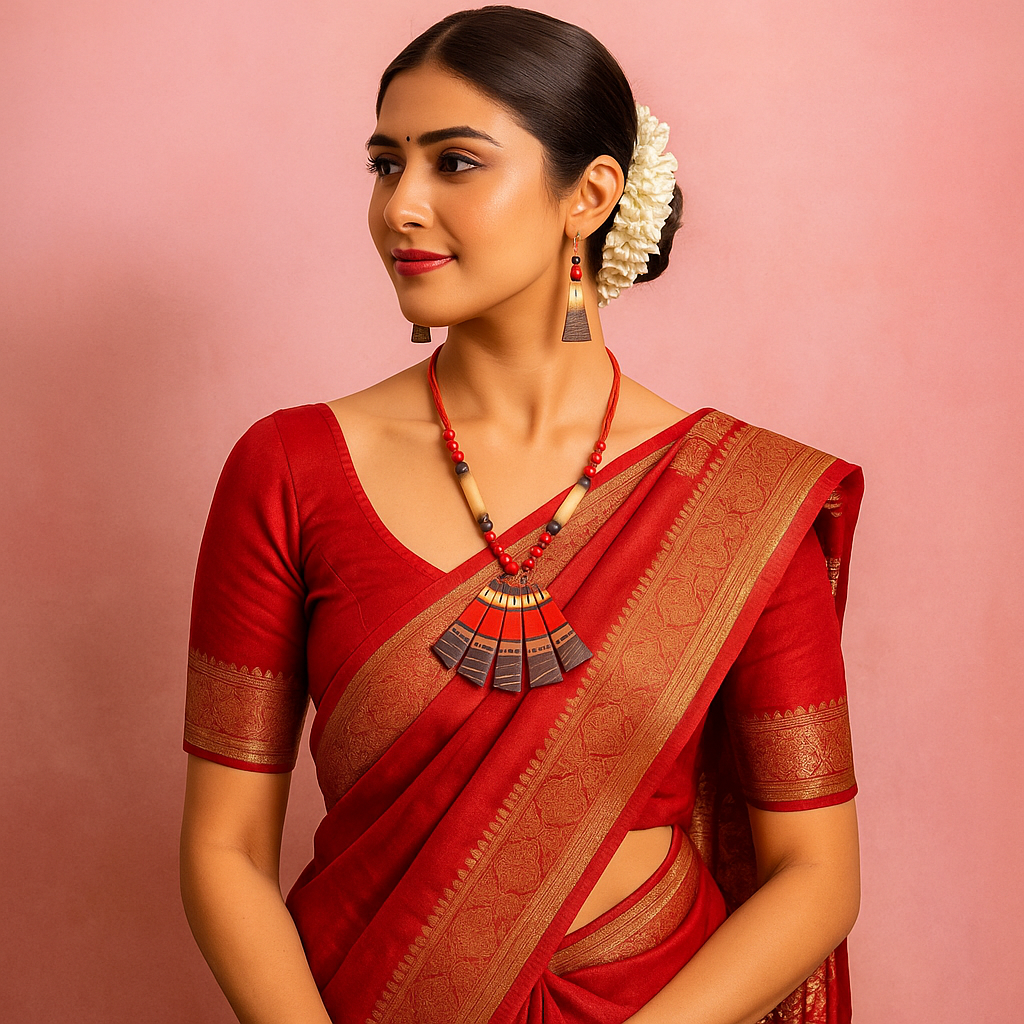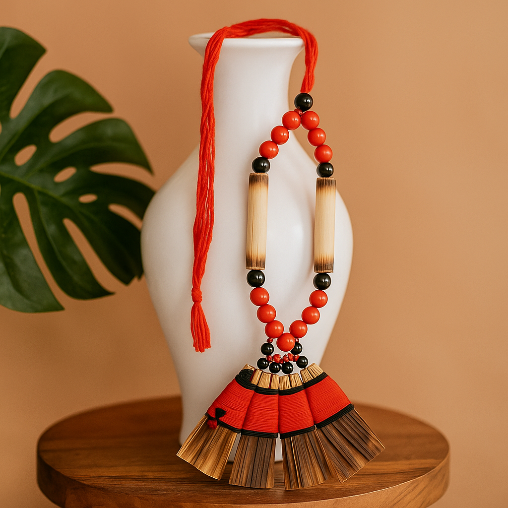 Pendant Design: Fan-shaped handcrafted pendant with red thread wrapping and natural grass tips, accented with black stripe detailing