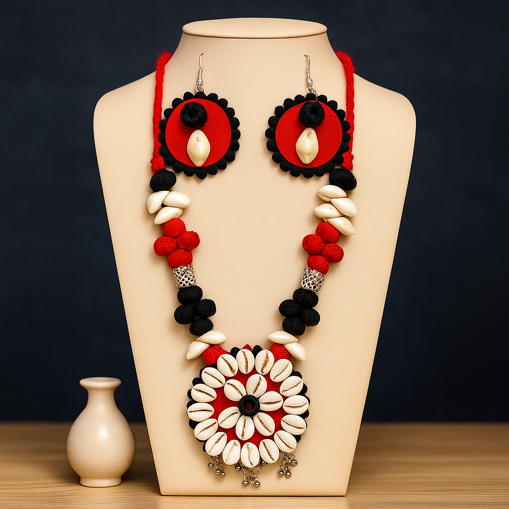 Pendant Design: Large floral pattern pendant with alternating cowrie shells and black bead petals, finished with oxidized jhumka drops