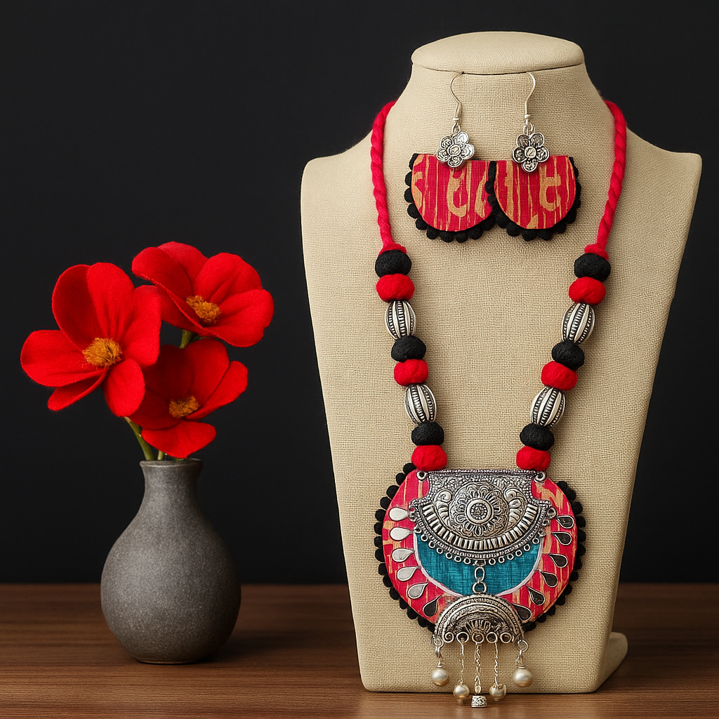Earrings: Matching red-black fabric earrings with oxidized floral studs