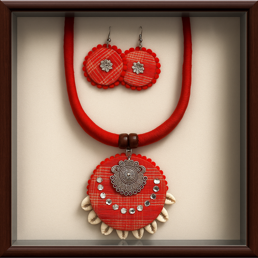 Pendant Design: Round red fabric pendant with oxidized silver floral motif, mirror embellishments, and cowrie shell border