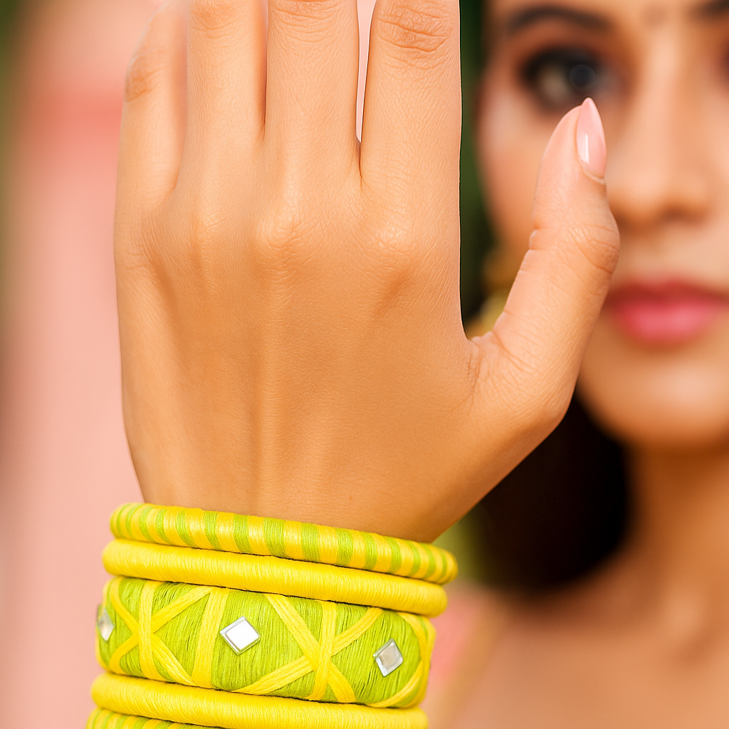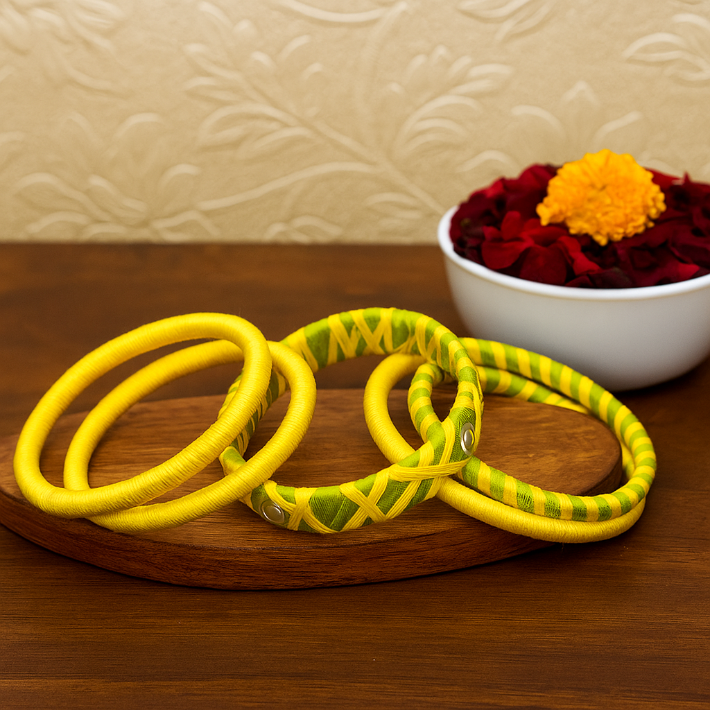 Beautiful yellow and green dual-tone bangles wrapped in fine silk thread