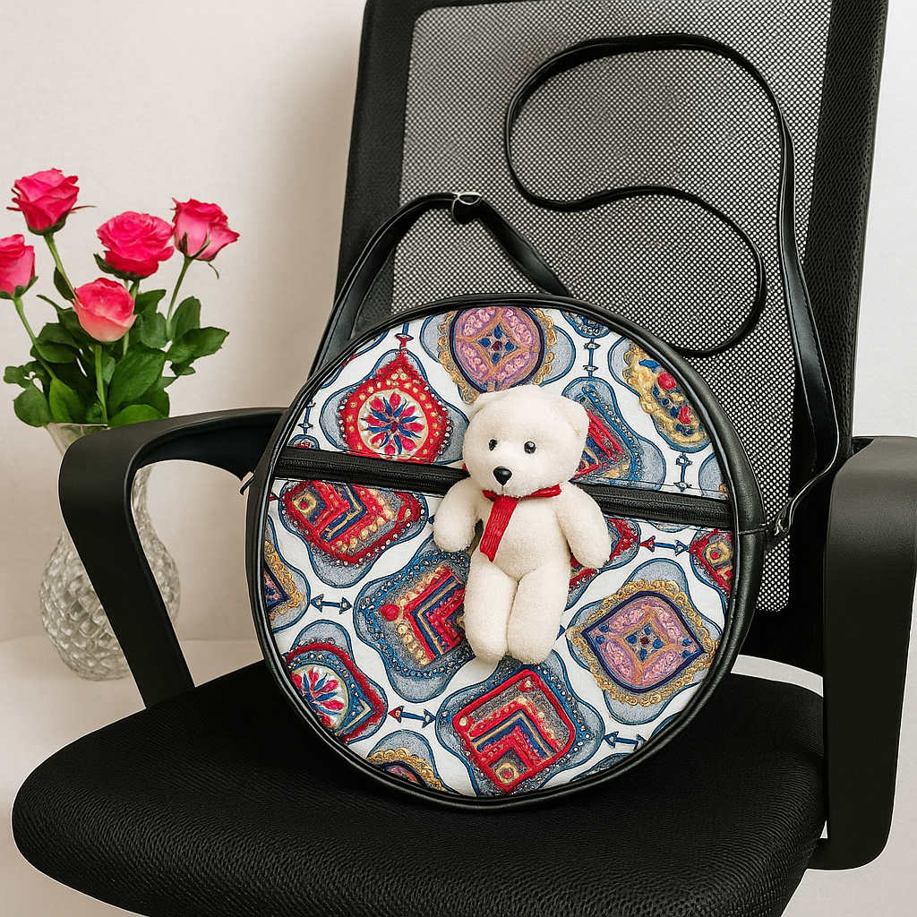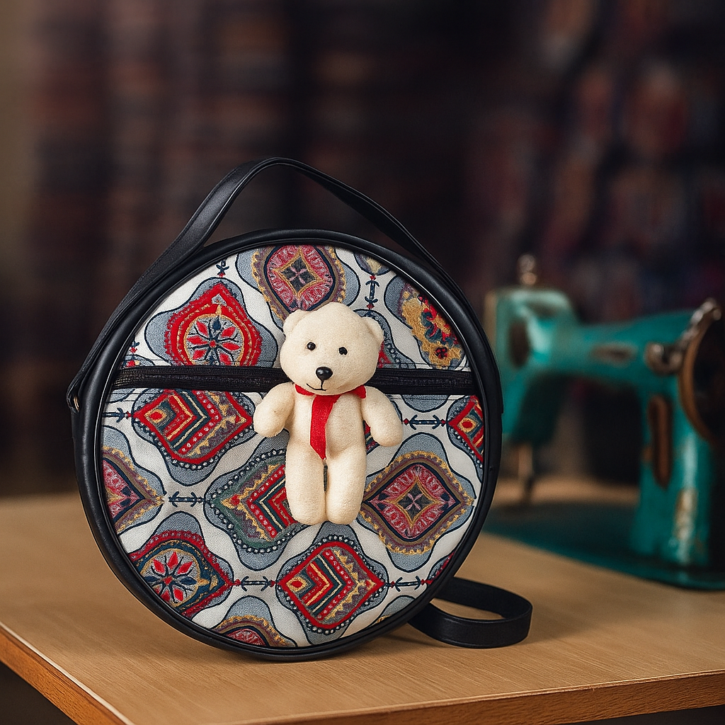 Design: Round bag in vibrant tribal prints with attached mini white teddy