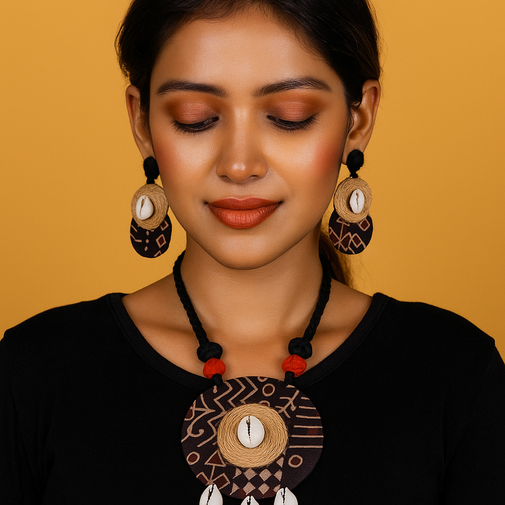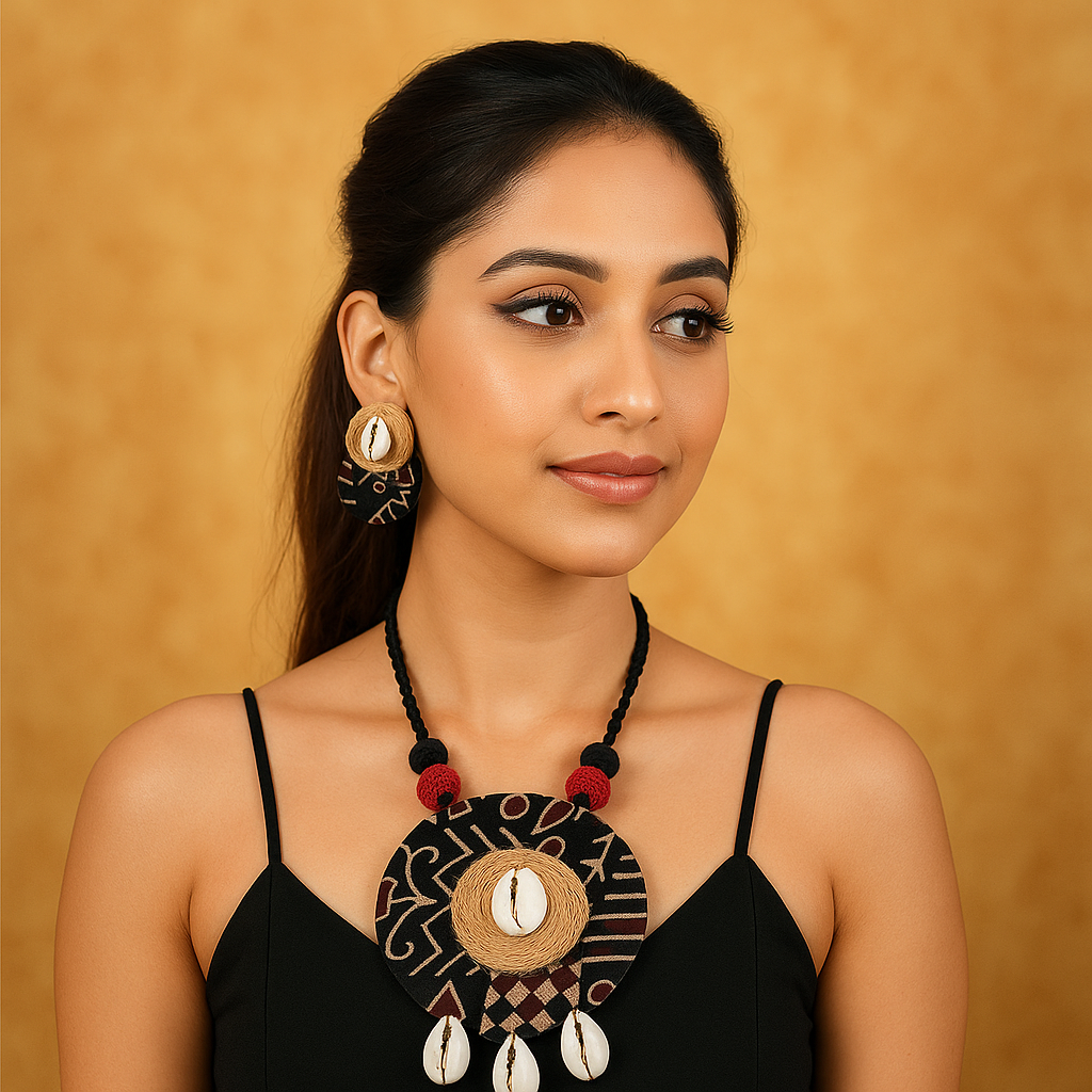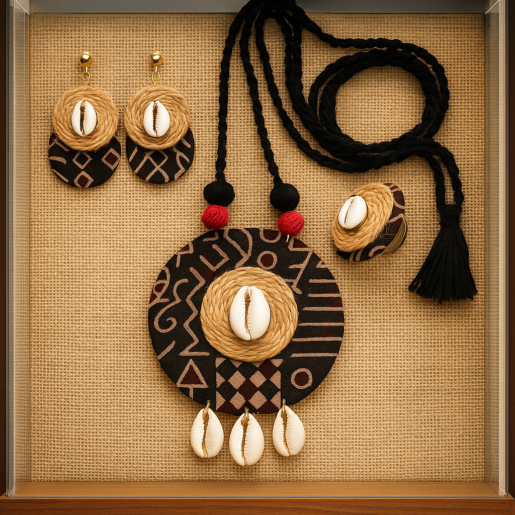 Decorative Elements: Hand-painted motifs, twine wrap, cowrie accents