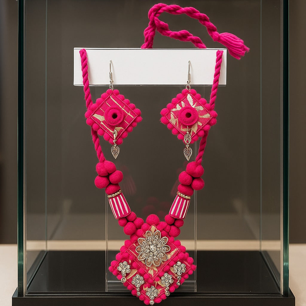 Handcrafted Beauty: Traditional necklace and earrings set made using soft pink cotton thread and tribal-inspired patterns.