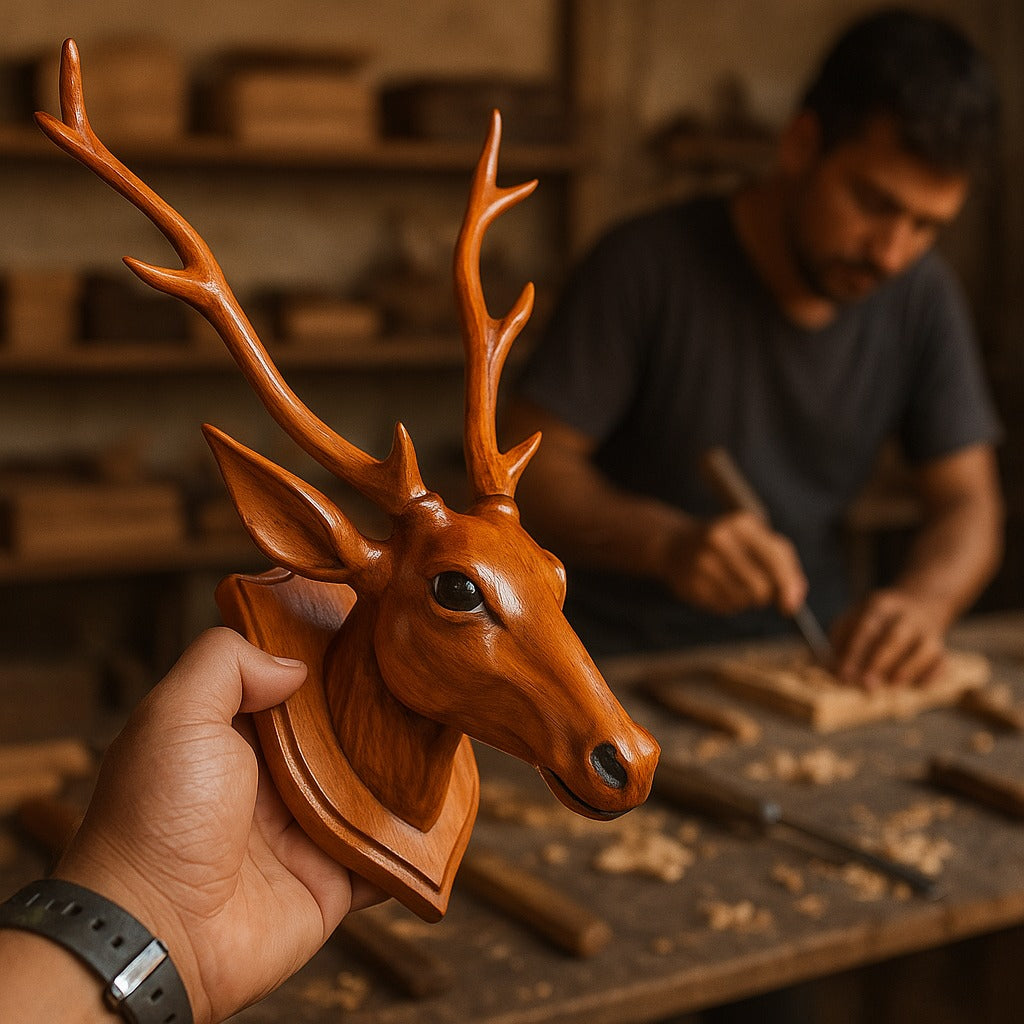 Design: Intricately carved deer head with tall antlers and realistic detailing