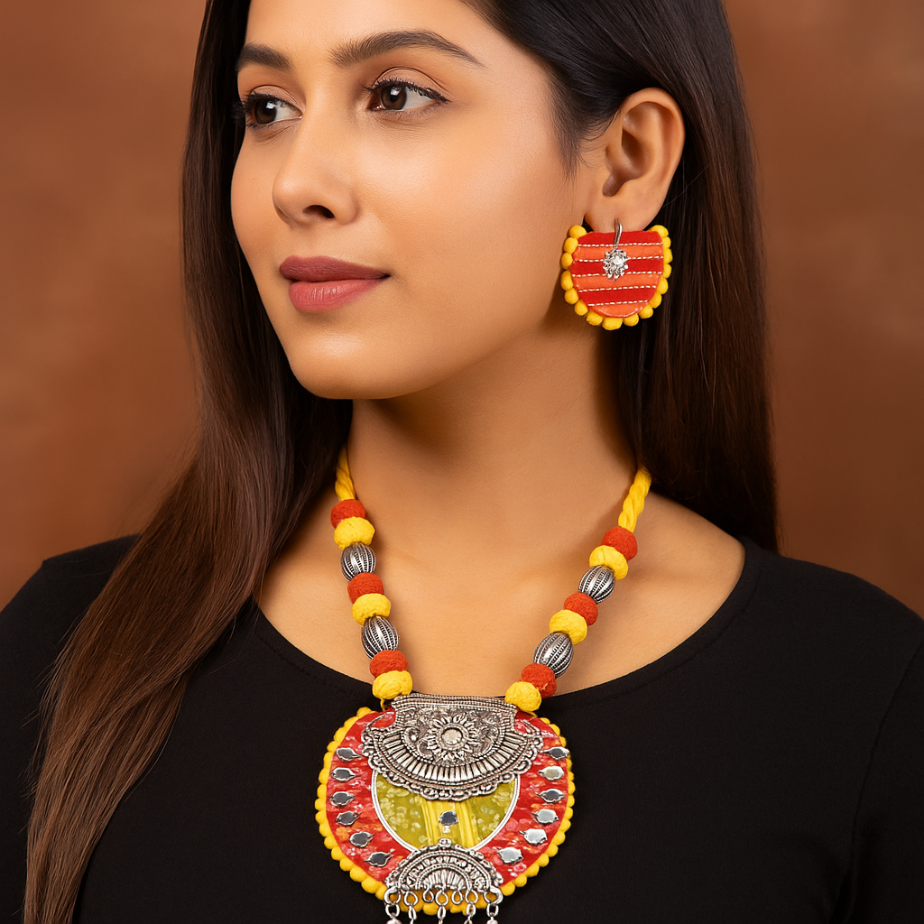 Thread Type: Yellow fabric cord with red-yellow pompom style beads and oxidized silver beads